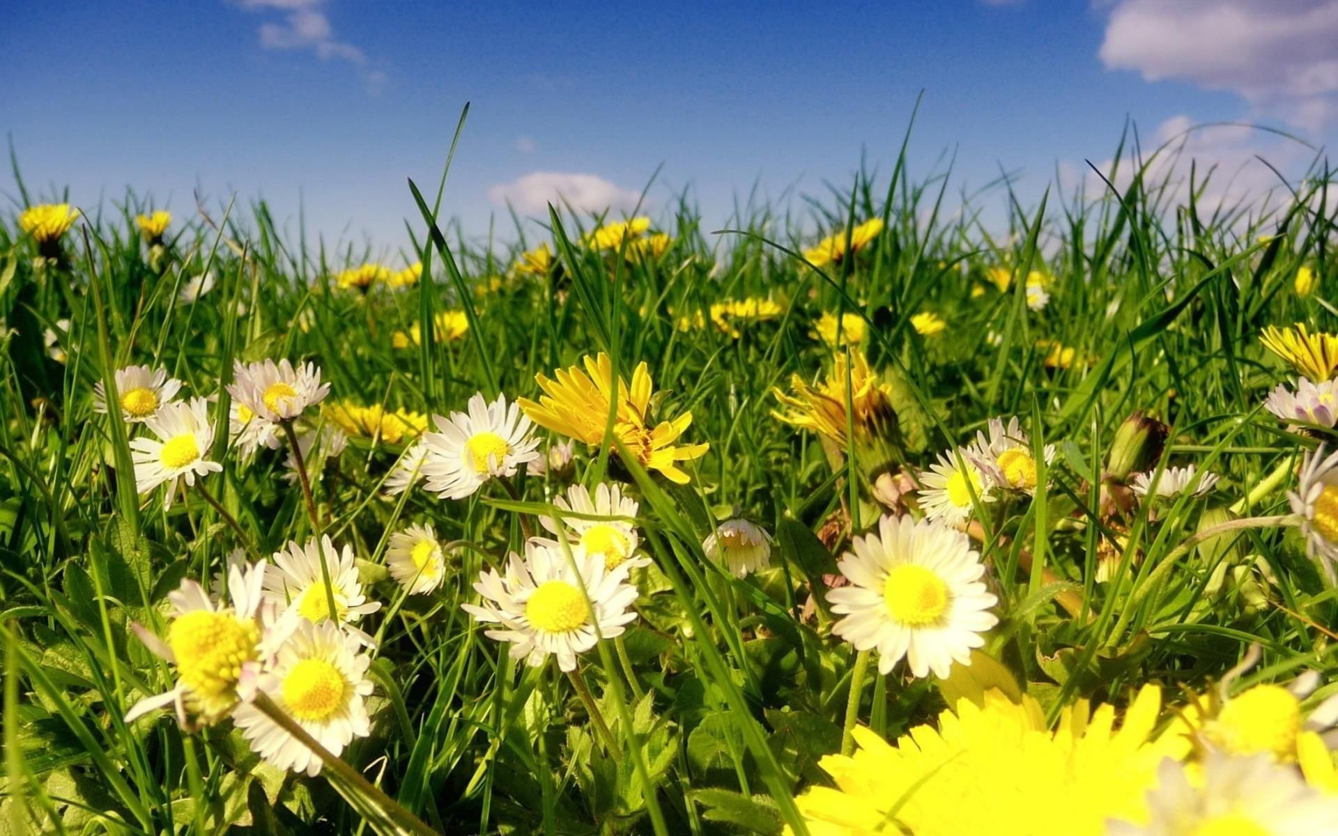 Поле одуванчиков с ромашками