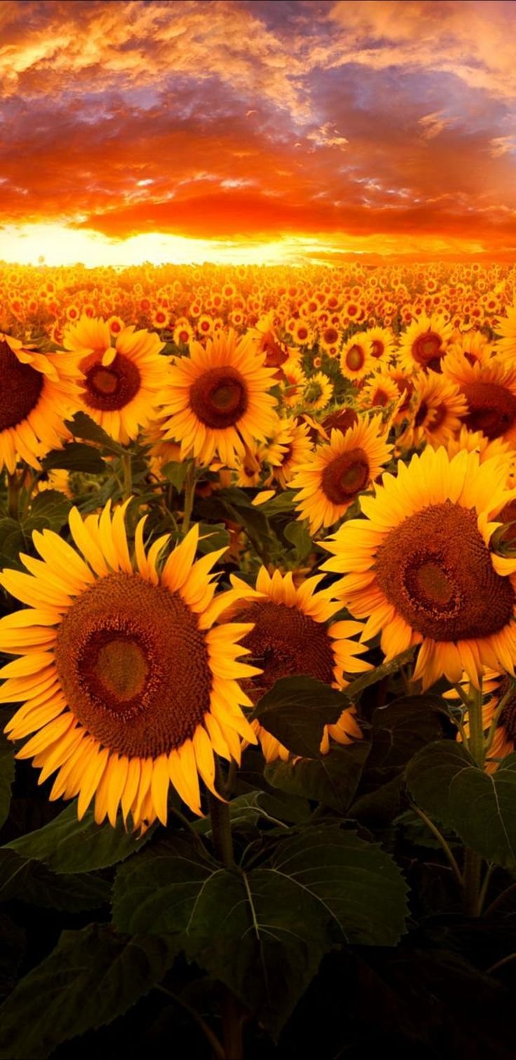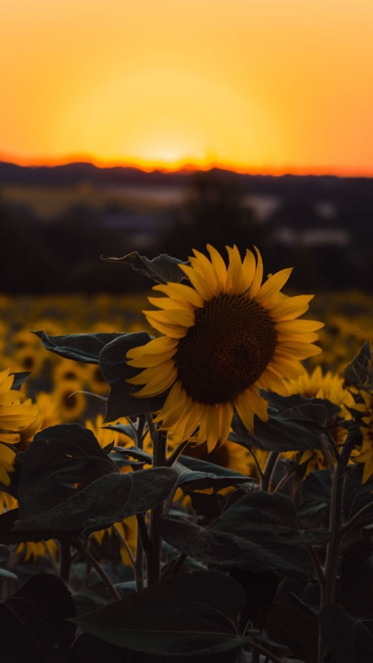 Поле подсолнухов на оранжевом закате